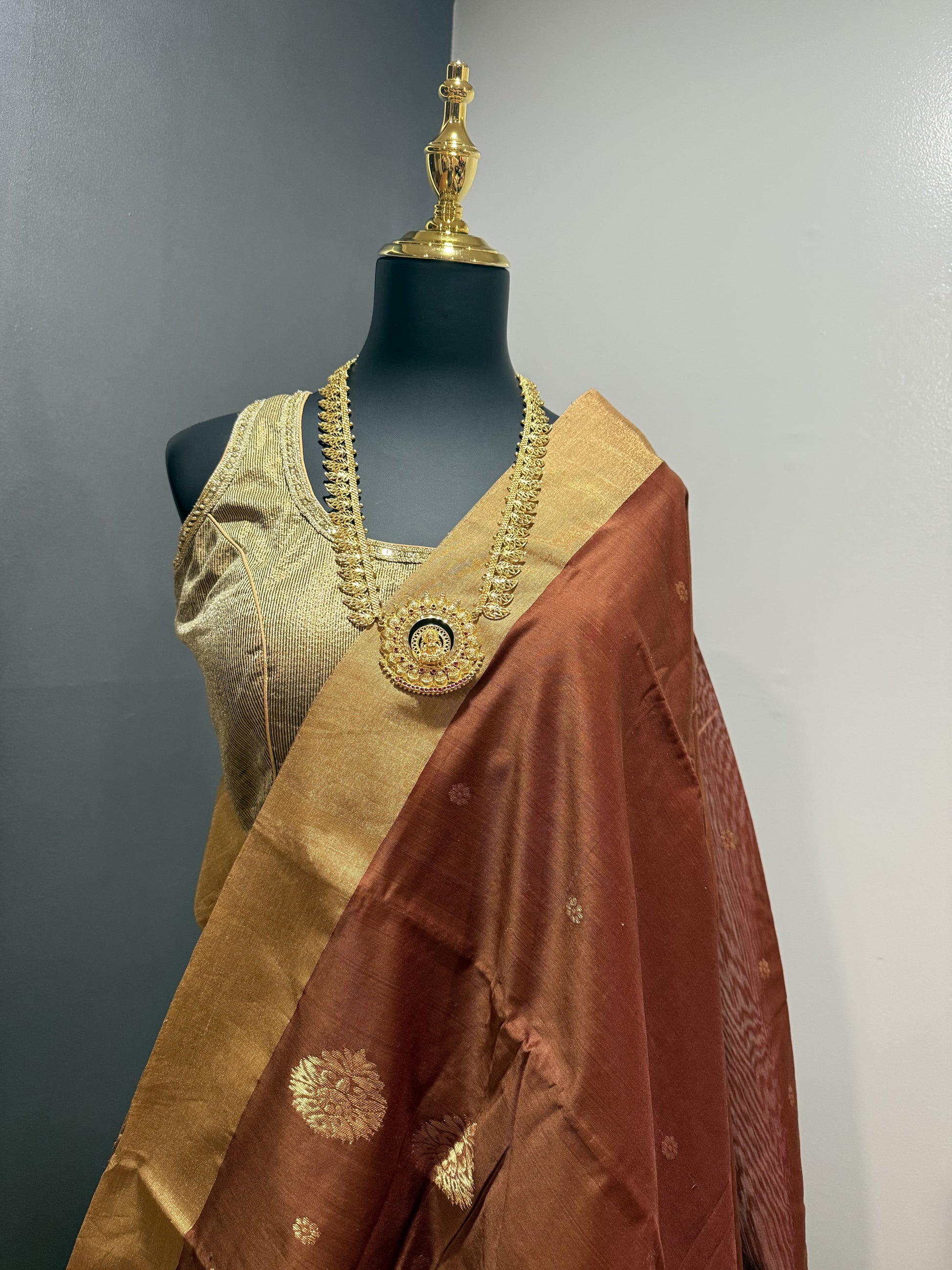 Rust Chanderi Silk saree with golden tissue border and floral buttas.
